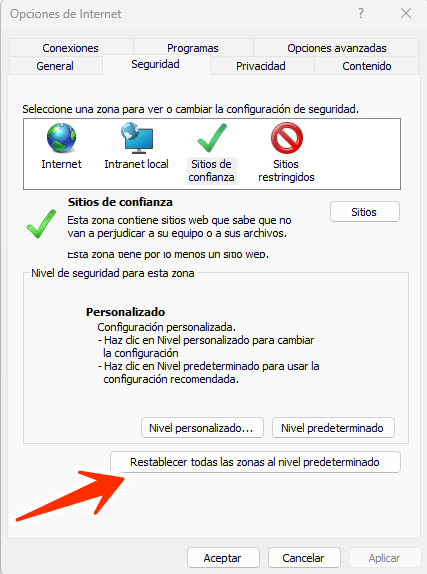 Paso 2: En opciones de Internet-pestaña Seguridad, en sitios de confianza vamos a dar clic en Restablecer todas las zonas al nivel predeterminado